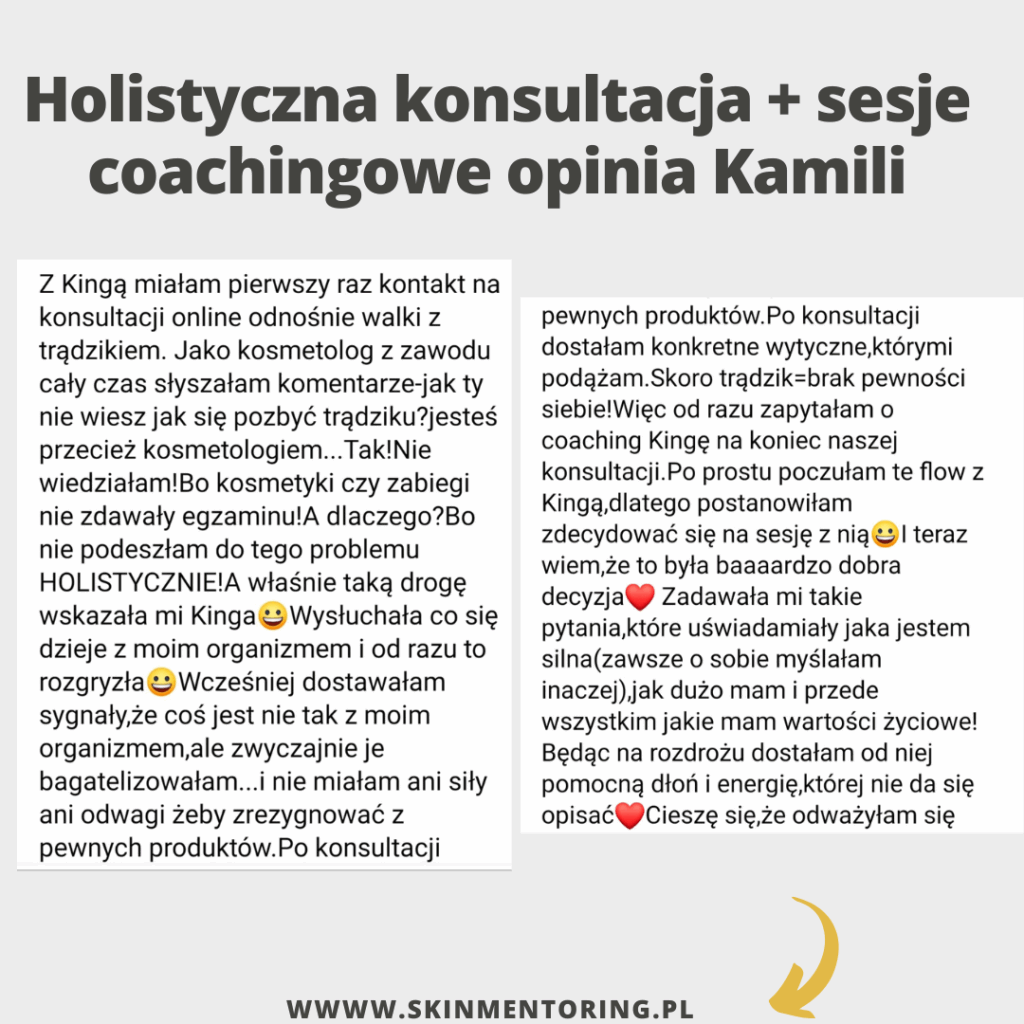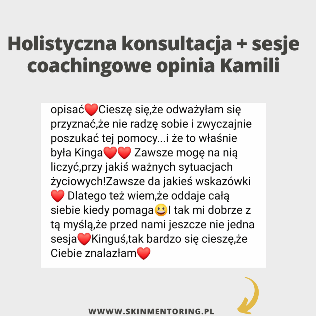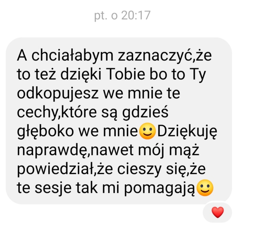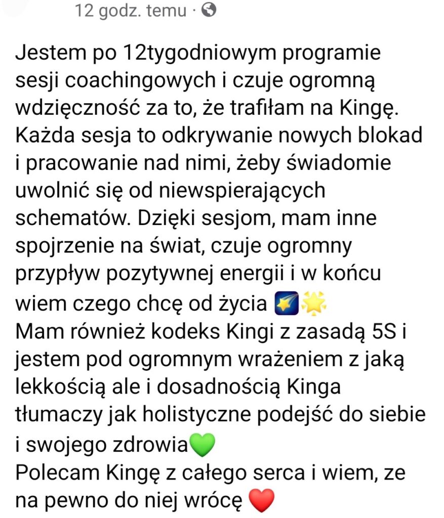 Kinga to bardzo ciepła osoba, która potrafi pomóc. Naprawdę pomoc, choć może Ci się teraz to wydaje niemożliwe by w 1h zmienić czyjes życie. A jednak. Dzięki niej zrozumiałam jaki najważniejszy błąd popełniam i co mogę zmienić. Dzięki temu lepiej sobie radzę w sytuacjach, które wcześniej totalnie mnie pogrążały. Dziękuję Ci, Kinga z całego Nasza przygoda dopiero się zaczyna”